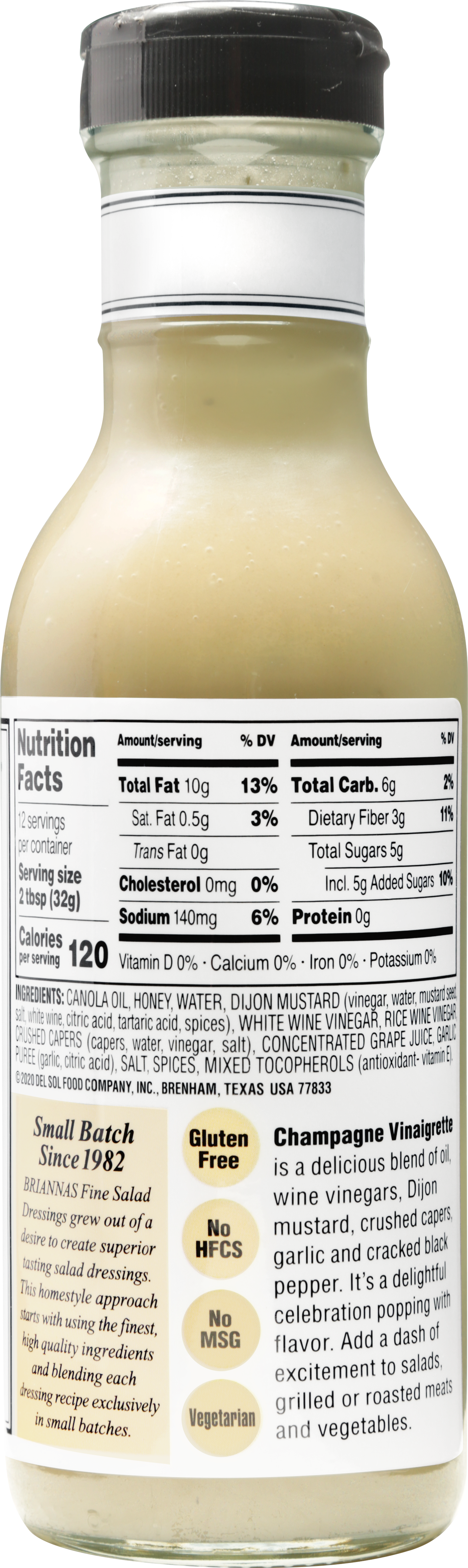 It’s sure to add a dash of unexpected excitement to any salad—not to mention grilled or roasted meats and vegetables. Our Champagne Vinaigrette Salad Dressing is yet another awesome taste sensation from the dressing company that specializes in topping all the rest—BRIANNAS!