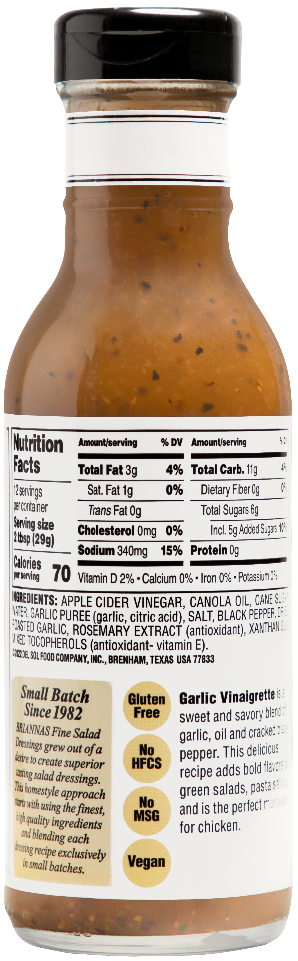 BRIANNAS Garlic Vinaigrette is a sweet and savory blend of garlic, oil, and cracked black pepper that adds bold flavor to anything! It is perfect for green and pasta salads and is the perfect marinade for chicken! This flavor comes in a pack of 6.